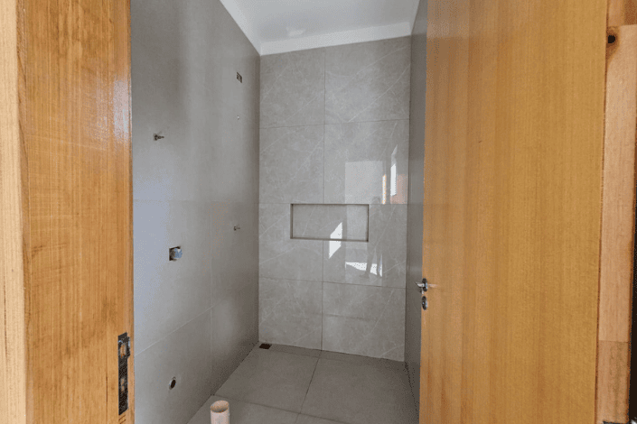 Casas com 3 quartos sendo 1 suíte, Sala, Cozinha, Banheiro social, Área de serviço/ Área Gourmet, garagem paralela para dois carros descoberta (81,74 m²), 169,83 m² de terreno, 9 m de frente.